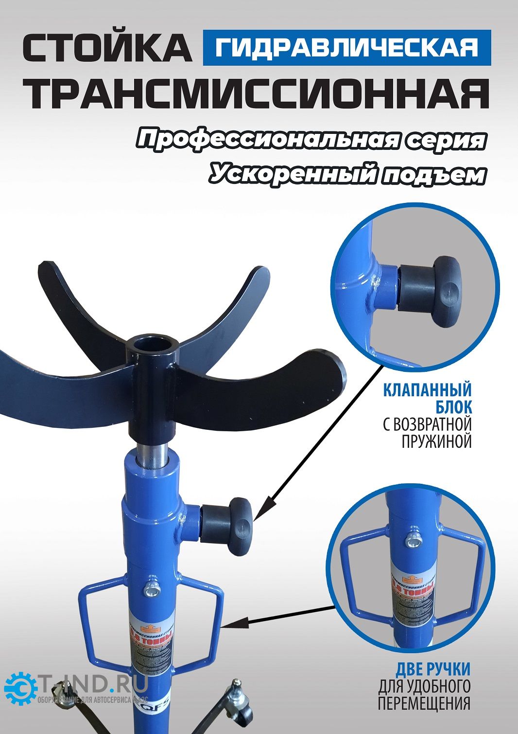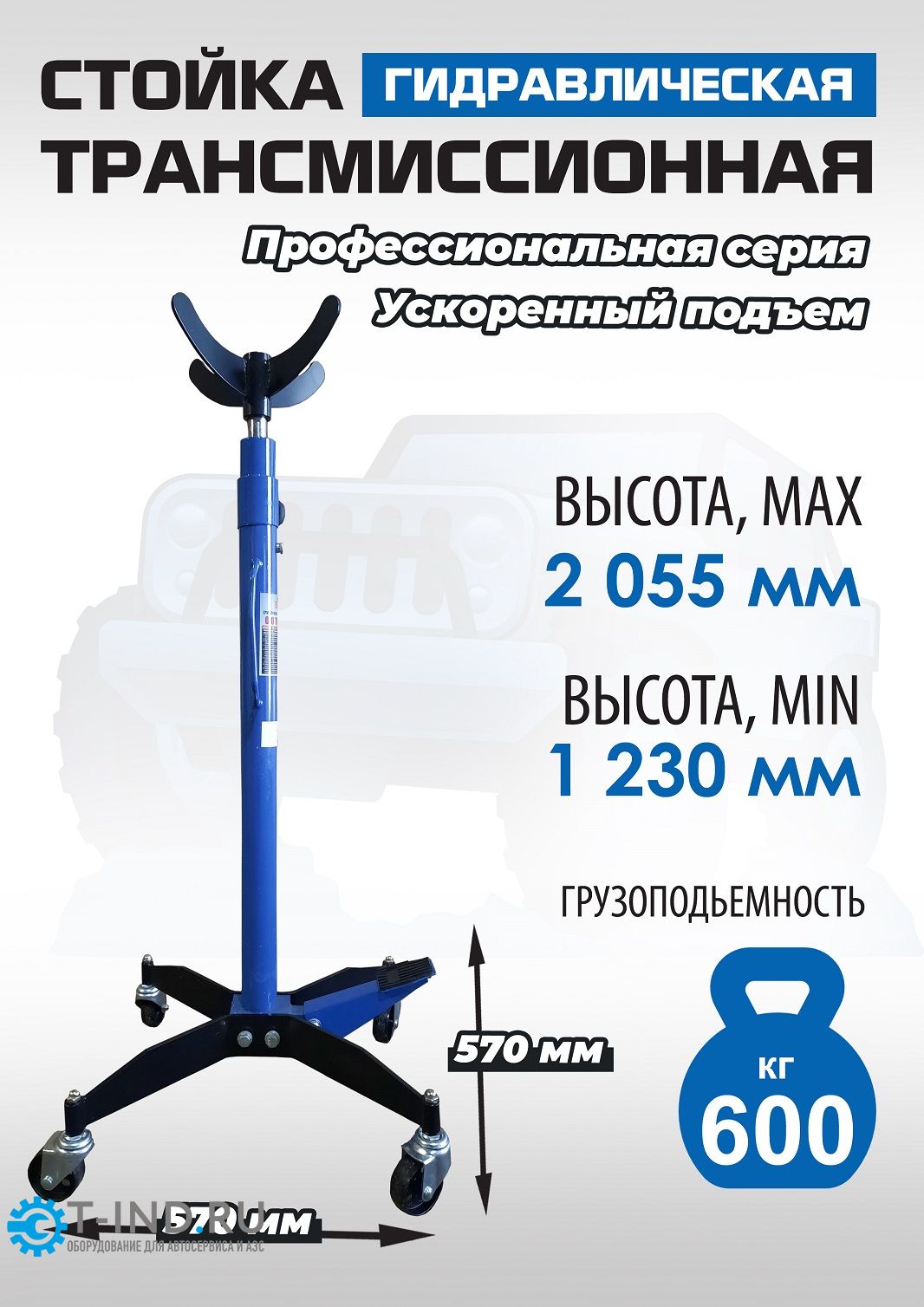 Стойка трансмиссионная гидравлическая 600кг EQFS ES0905. Профессиональная серия. Ускоренный подъём. Мощная педаль. Хромированный шток. Две ручки для перемещения. 4 поворотных колеса с подшипниками обеспечивают легкость перемещения. Для монтажа и демонтажа узлов трансмиссий, тормозных суппортов и других агрегатов автомобиля, или технического обслуживания. Высота подъём = 1230-2055 мм. г/п 600 кг. Стойка трансмиссионная гидравлическая является мобильным подъемным механизмом.