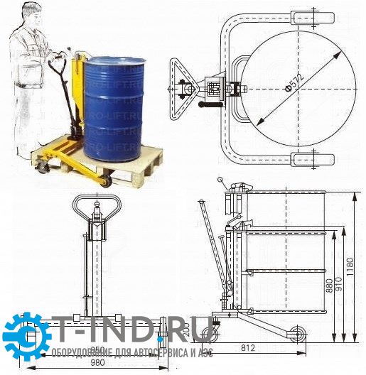 Тележка-бочкокат для снятия бочек с поддонов Euro-Lift DTR250 предназначена для снятия с поддонов и перемещения стандартных бочек d 572 мм, 210 л. по территории складов, цехов, торговых залов.