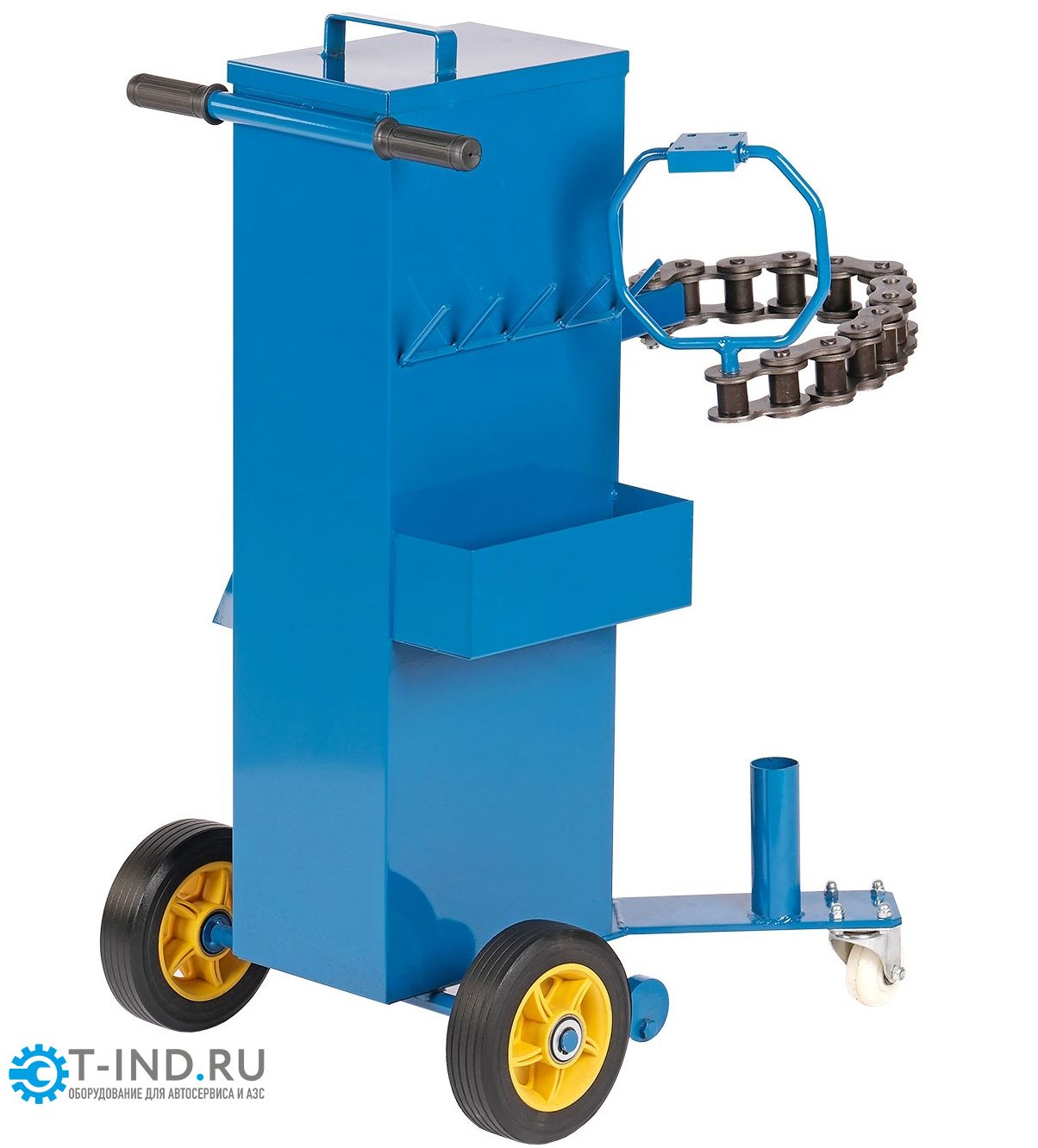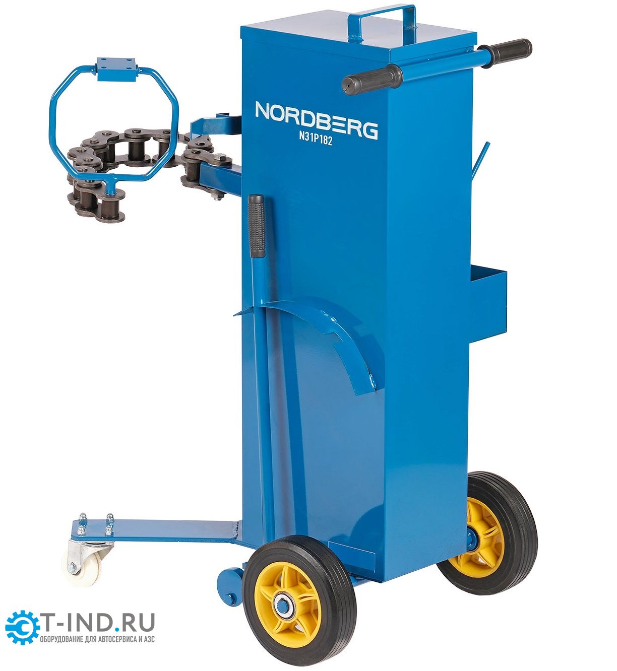 Тележка-держатель с цепью для пневмогайковерта NORDBERG N31P182 – вспомогательное оборудование для совместного использования с пневматическими инструментами на автотранспортных предприятиях, станциях шиномонтажа, в автосервисах. Предназначена для работ по отворачиванию и заворачиванию резьбовых соединений (гайки, болты, шпильки, футорки и прочее), используется в качестве "шасси" совместно с однодюймовыми пневмогайковертами, обеспечивает удобство транспортировки до места работ и хранение основного инструмента.