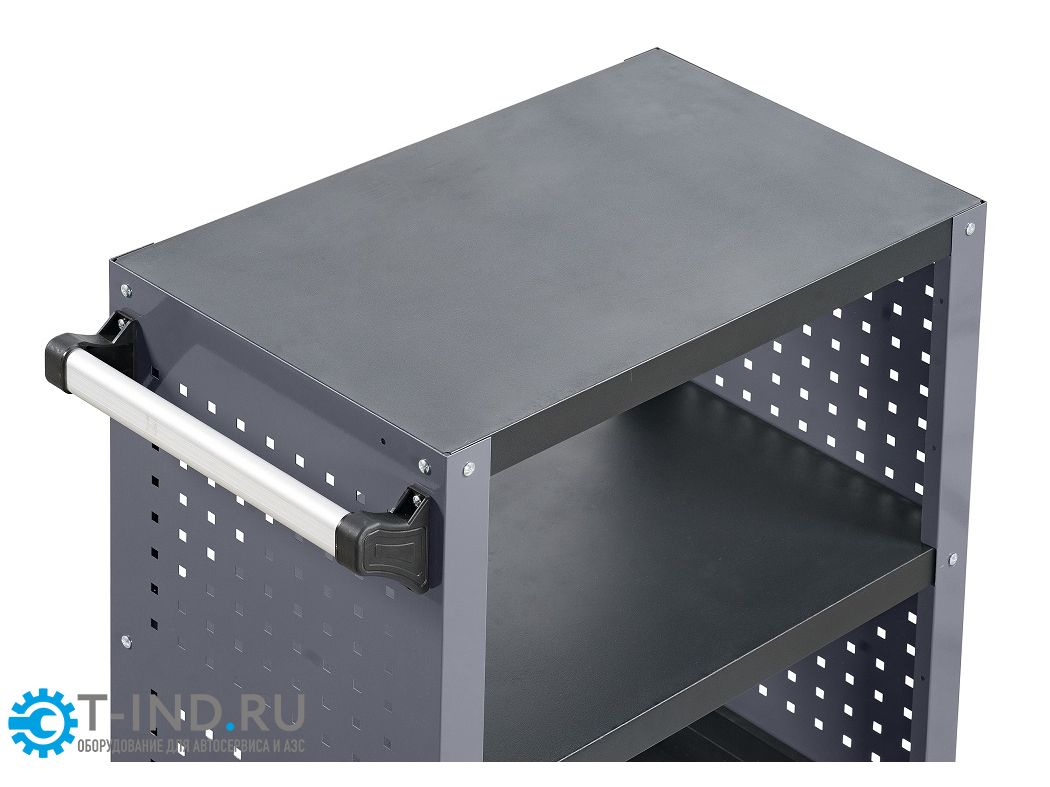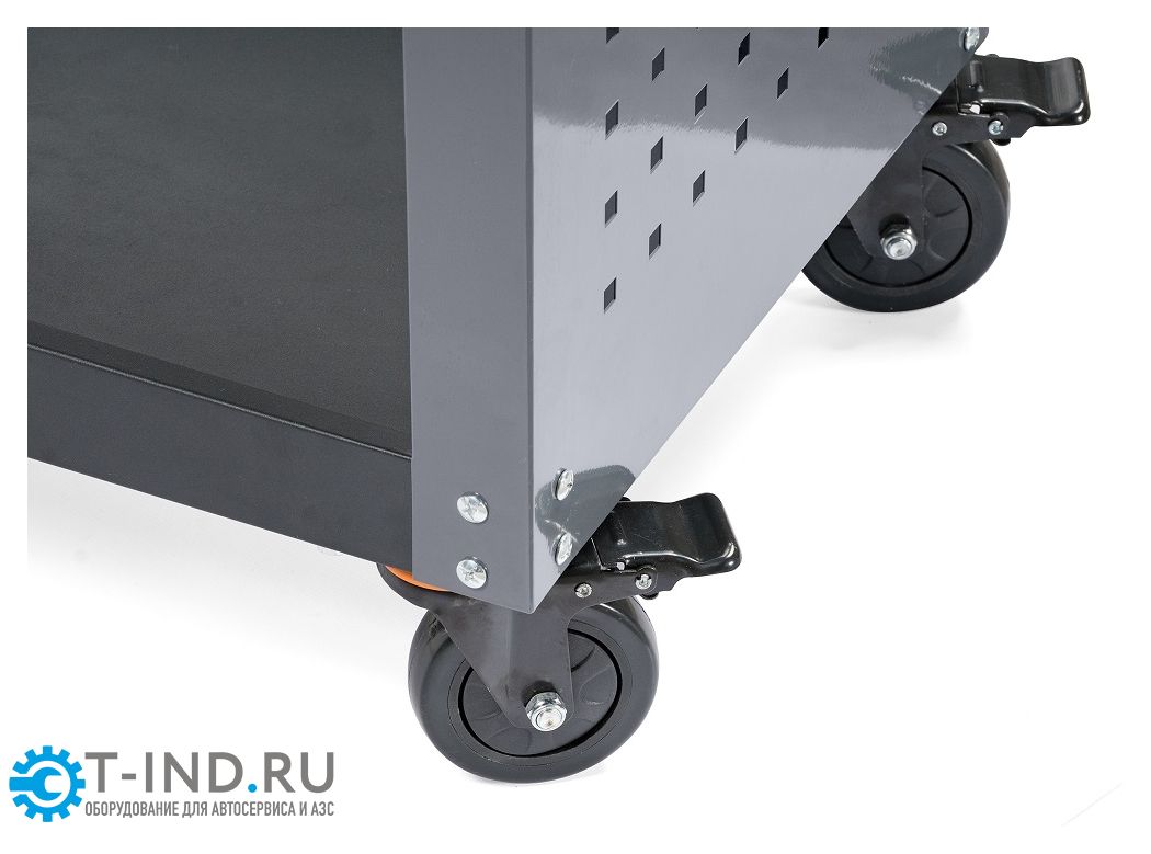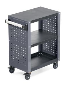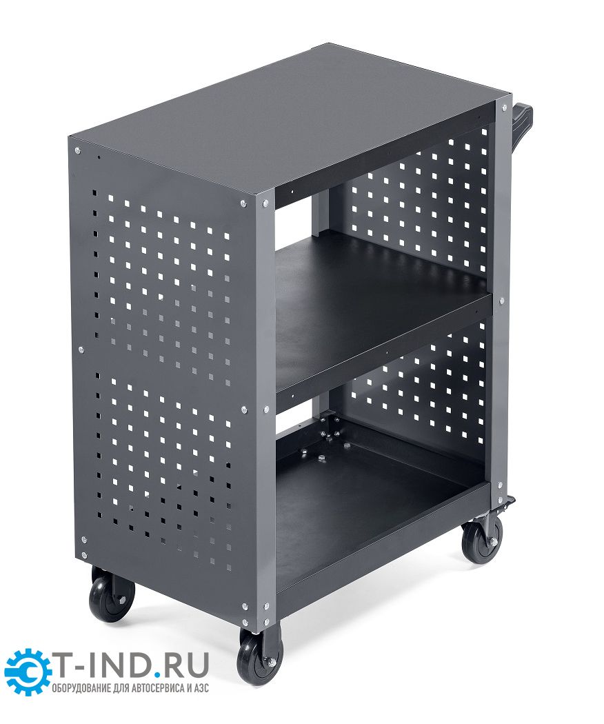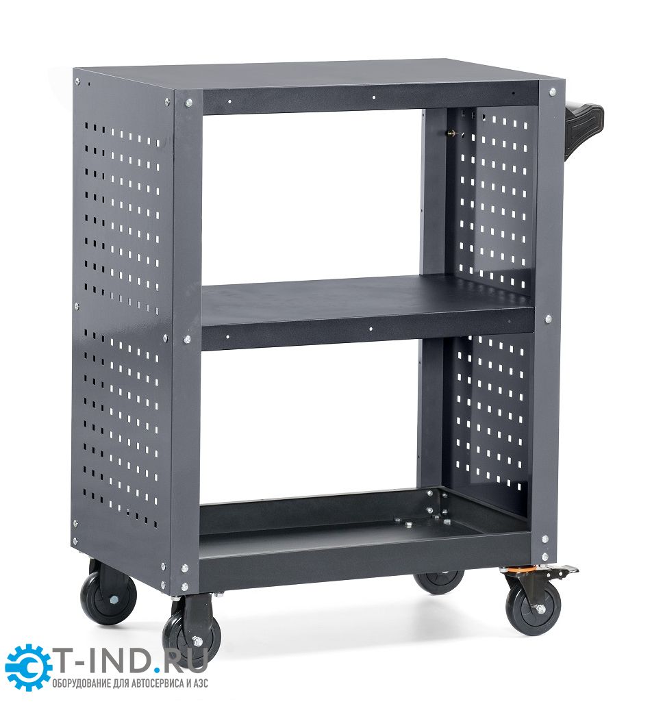 Инструментальная тележка KRW-T3PG с 3-мя открытыми полками и перфорированными боковинами предназначена для оборудования рабочих мест в автосервисах, мастерских и других производственных помещениях. Корпус тележки изготовлен из высококачественной стали и окрашен порошковой краской. Перфорированные боковины предусматривают установку крючков. Для перемещения тележки предусмотрены обрезиненные стальные колеса диаметром 100 мм, остнащенные стояночным тормозом. Тележка поставляется в разобранном виде и собирается достаточно просто и быстро.