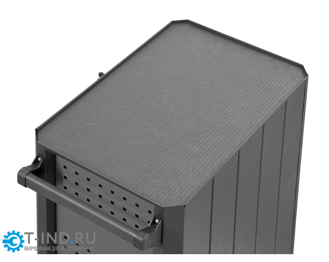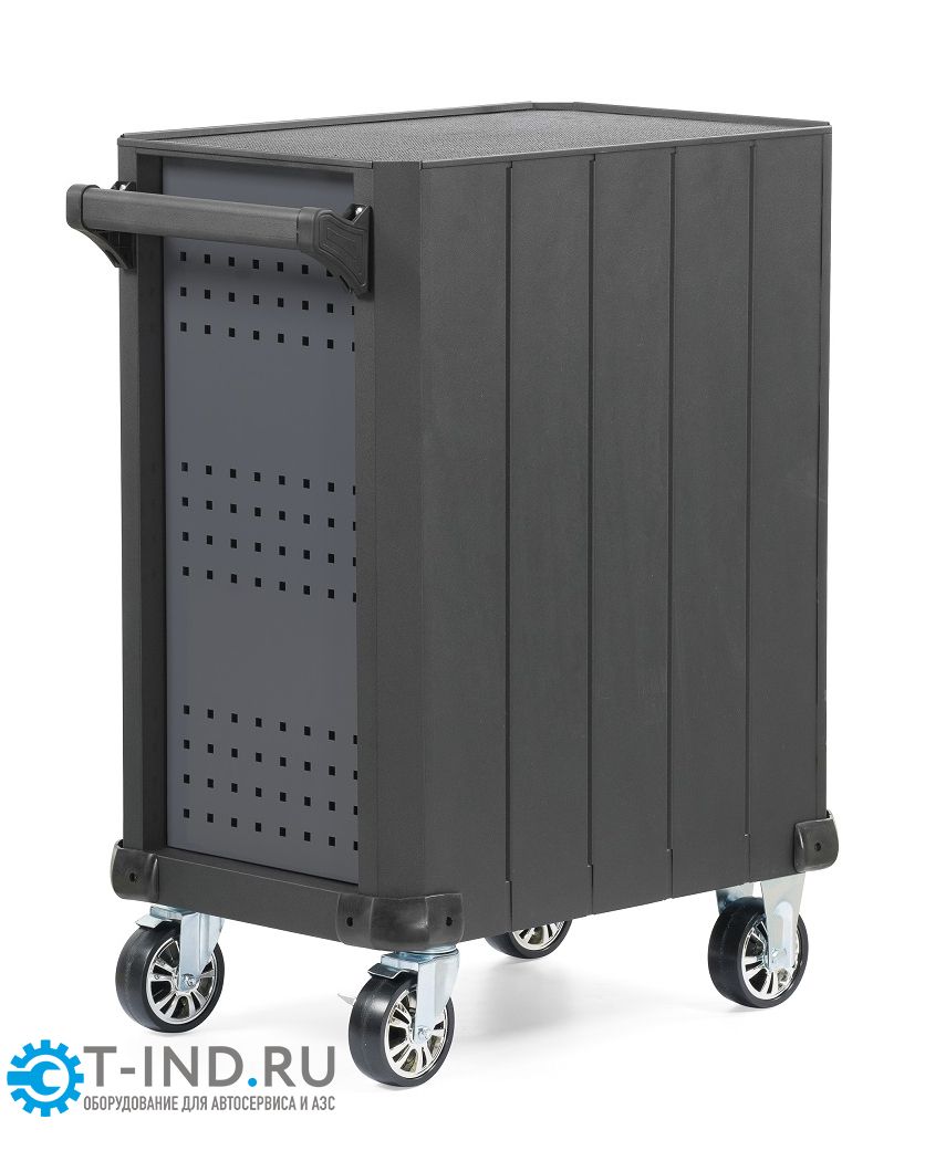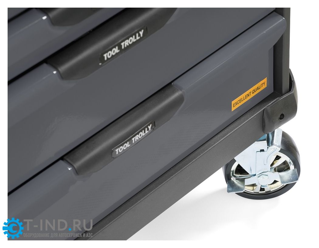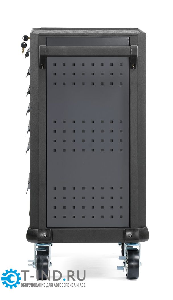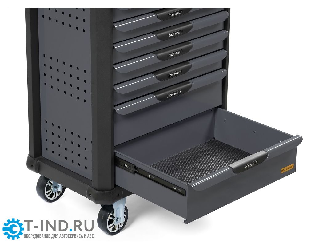 Инструментальная тележка KRW-T7D оснащена 7-ю выдвижными ящиками. Тележка предназначена для оборудования рабочих мест в автосервисах, мастерских и других производственных помещениях. Телескопические направляющие ящиков имеют механизм фиксации, не позволяющий самопроизвольно открыться ящику, даже если внутри находится инструмент, а также доводчиком, обеспечивающим плавное закрытие ящика. Корпус тележки изготовлен из высококачественной стали и окрашен порошковой краской. Перфорированные боковины предусматривают установку крючков. Для перемещения тележки предусмотрены обрезиненные стальные колеса Ф100 мм, одно из которых имеет стояночный тормоз.