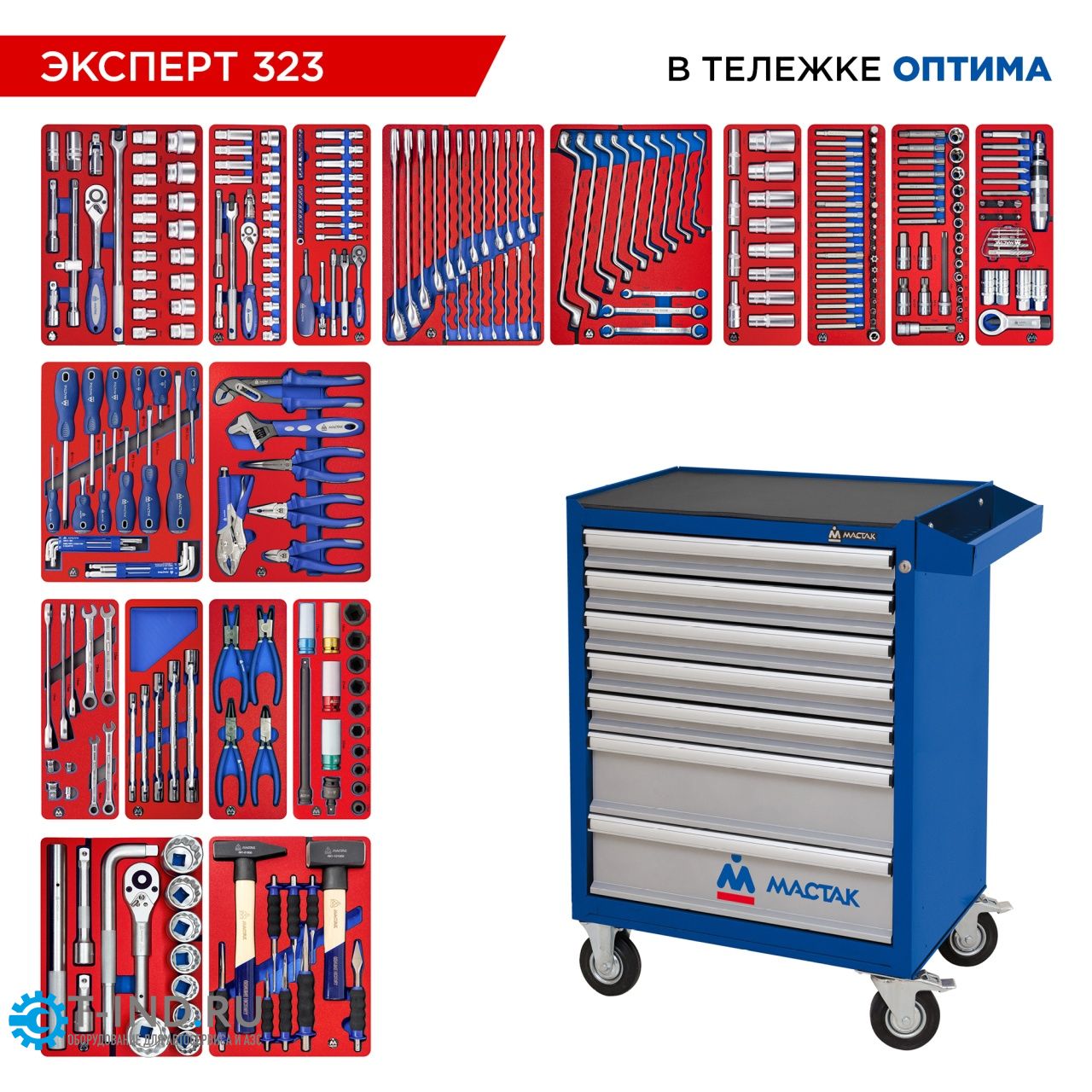 Тележка инструментальная Мастак Оптима 52-07323B, закрытая, 7 ящиков, с набором инструментов 323пр.