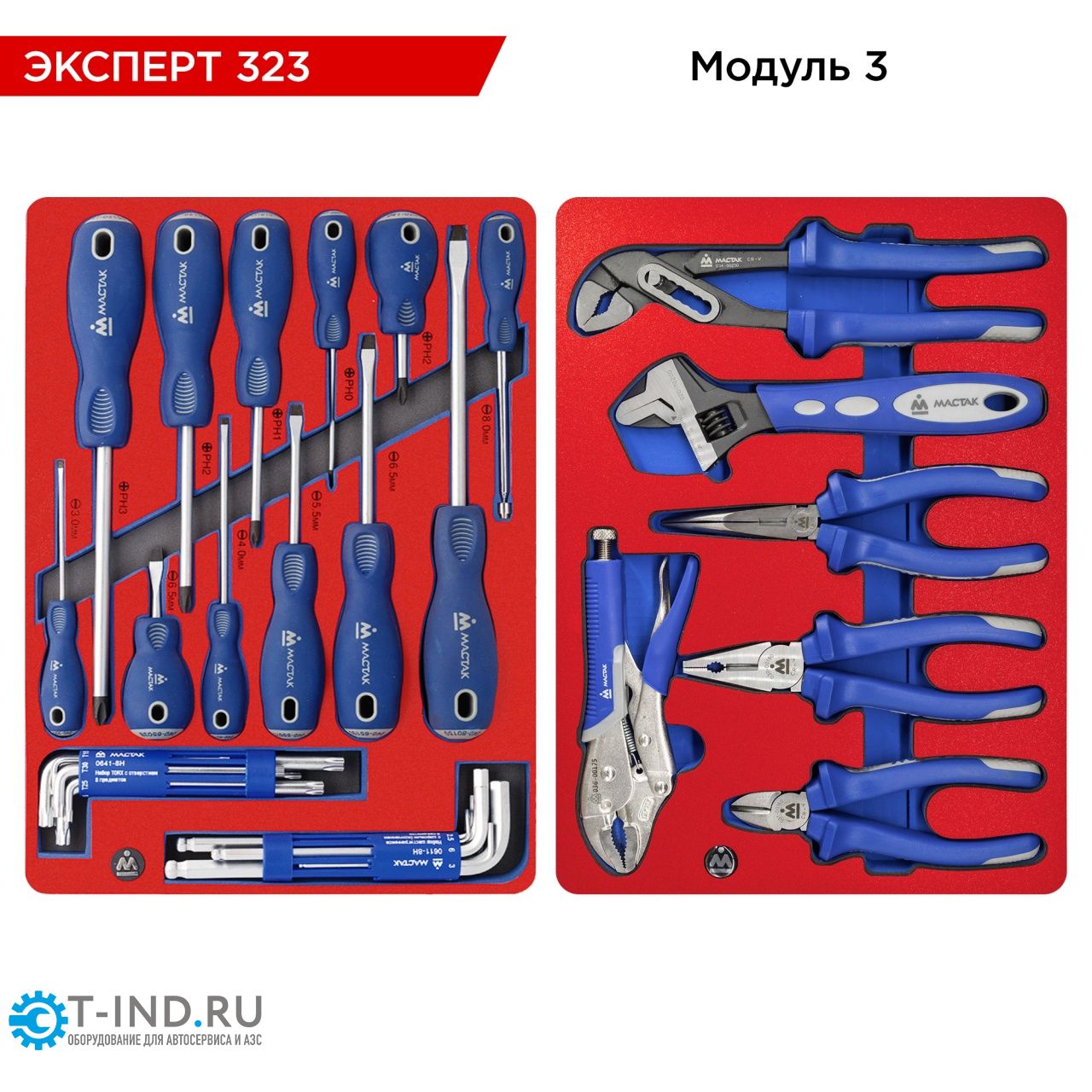 Инструментальная тележка Мастак 521-07581B серии "Оптима" с набором инструментов Эксперт 323 предназначена для организации рабочего места в любом производственном помещении, станции технического обслуживания или авторемонтной мастерской. Разместив инструмент в тележке по типу, назначению или частоте использования, ваше рабочее место всегда будет в полном порядке и вы всегда будете иметь под рукой тот инструмент или приспособление, которое вам необходимо в данную минуту. Ручка-карман для управления при передвижении тележки, а также для мелочей. Центральный замок блокирует открытие всех полок одним поворотом ключа. Защитный коврик из полимерного материала для защиты верхней столешницы тележки. Одна пара колёс поворотные, с блокировкой вращения. Отсек для хранения инструмента позволяет хранить габаритный инструмент и приспособления. Закрывается на ключ. Материалы – инструментальные стали Cr-V, Cr-Mo, SNCM+V (S2), конструкционная сталь, хром, пластики PP, вспененный PVC, PP+TPR (рукояти отвёрток, трещоток, шарнирно-губцевого инструмента), дерево (рукоять молотка), EVA+PP (ложементы)