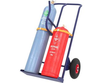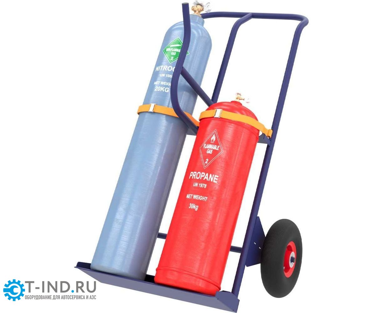 Тележка - сварочный пост RUSKLAD КП 2 У с пневматическими колёсами и системой фиксации баллонов КП 2 У пневмо ремень обладает прочной металлической конструкцией с ручками, двумя пневматическими колесами диаметром 350 мм и одним дополнительным опорным колесом диаметром 160 мм. Изделие служит для транспортировки двух баллонов (пропан и кислород).