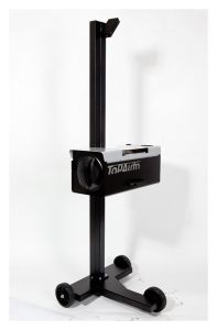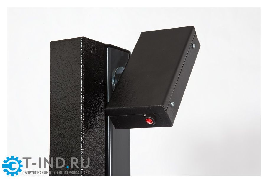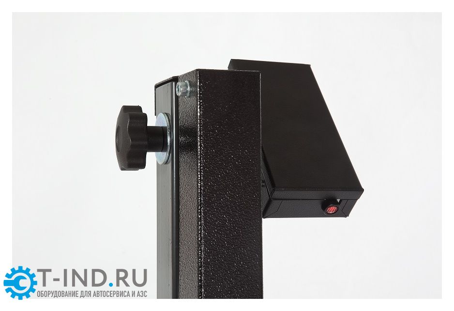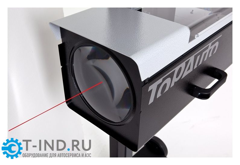 - Позиционирование прибора относительно транспорта осуществляется при помощи лазерного визира, зафиксированного в верхней части неподвижной стойки и лазерной системы центровки фары.