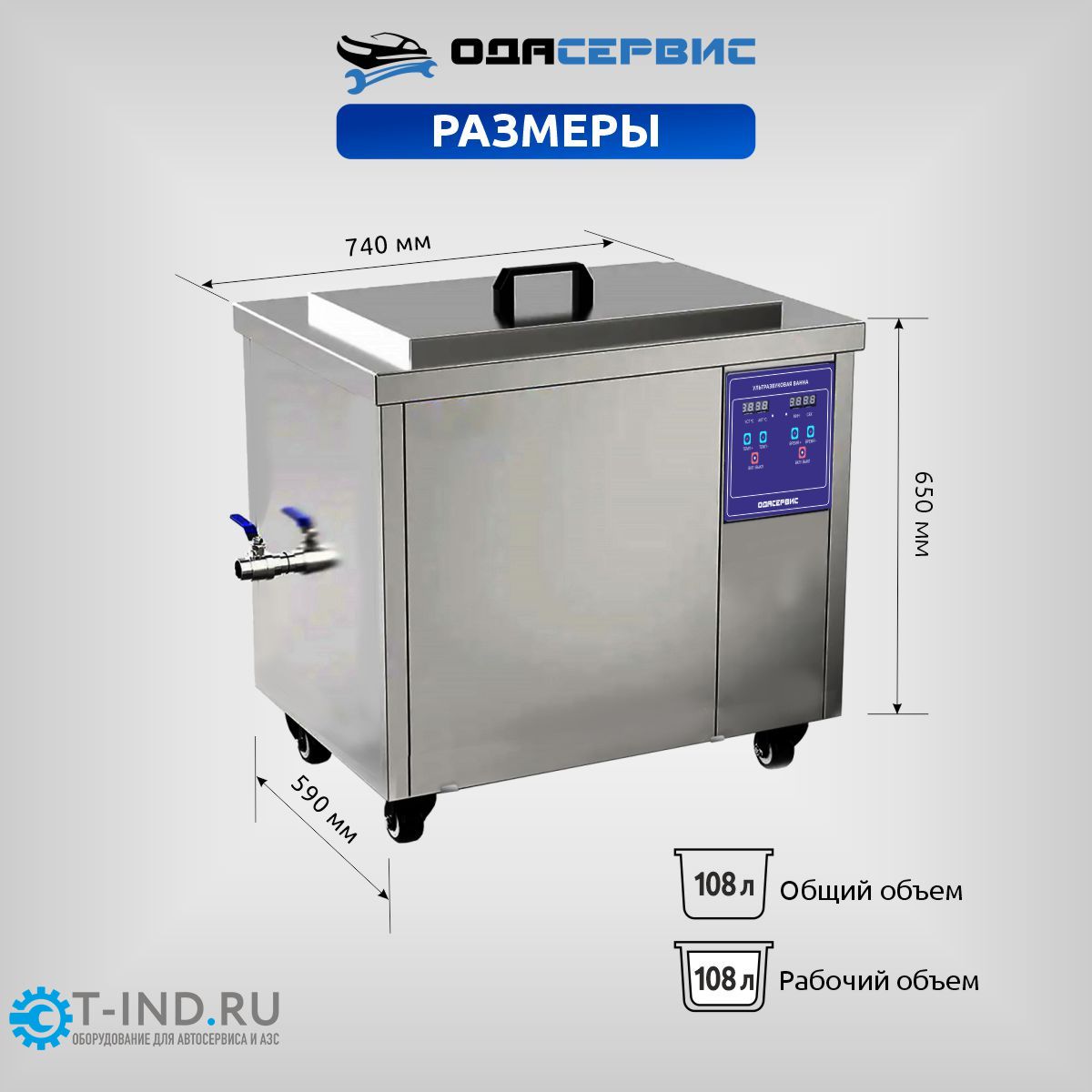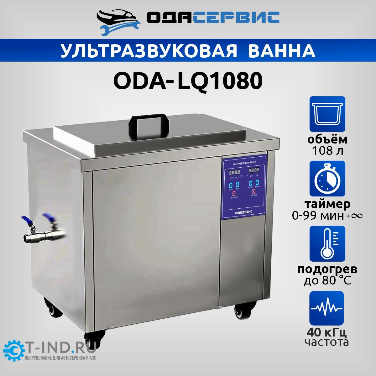ОДА Сервис ODA-LQ1080 — это промышленная ультразвуковая ванна на 108 литров с регулировкой мощности ультразвука, электронным таймером и подогревом. Такие ванны имеют широкий спектр применения, от мойки крупных и не очень деталей в автосервисе, до использования на производстве.