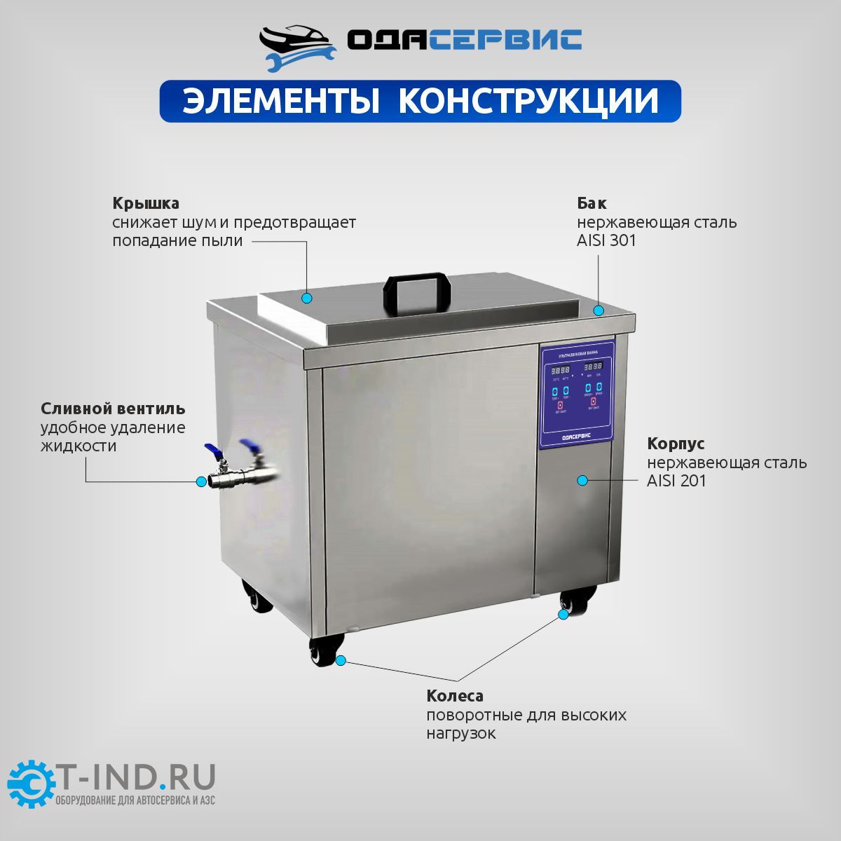 Корпус ванны изготовлен из нержавеющей стали AISI 201, а бак ванны изготовлен из AISI 301 нержавеющей стали, что делает его более стойким к коррозии и агрессивным моющим растворам.