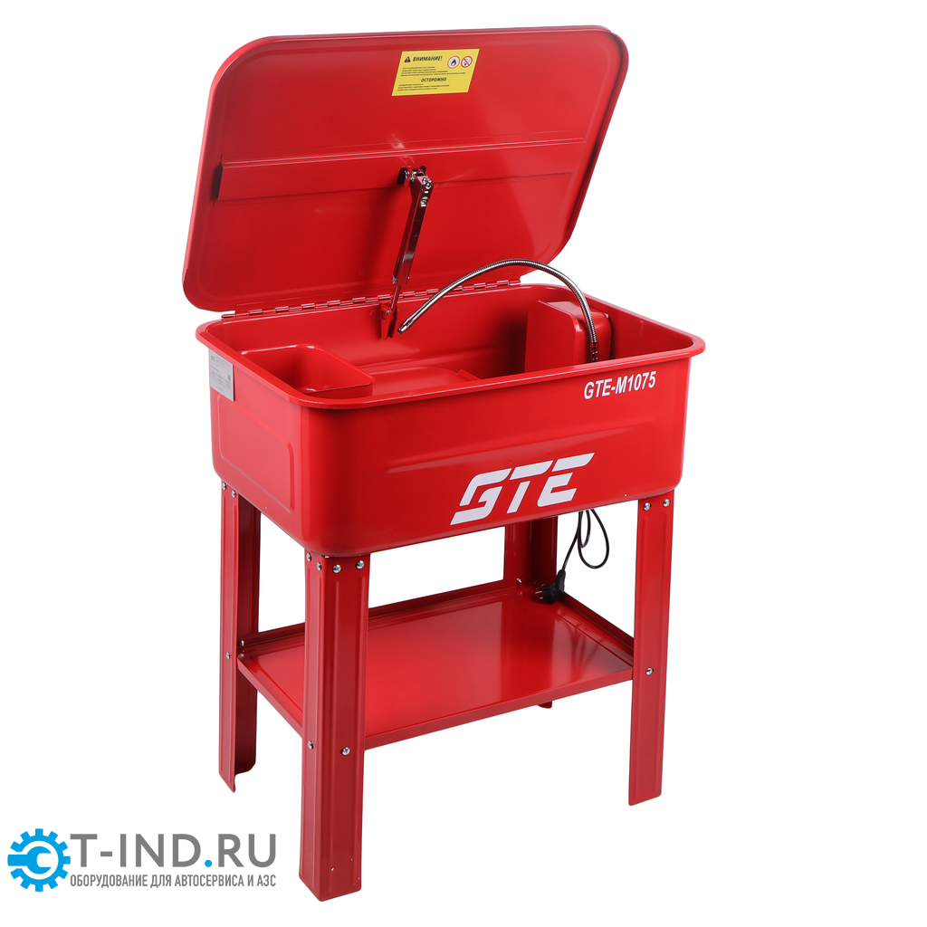 GTE‑M1075 — профессиональное оборудование для ежедневной очистки деталей и агрегатов автомобилей в автомастерских, гаражах и автотранспортных предприятиях. Очистка выполняется физико‑химическим методом с использованием циркулирующего моющего раствора на водной и щелочной основе.