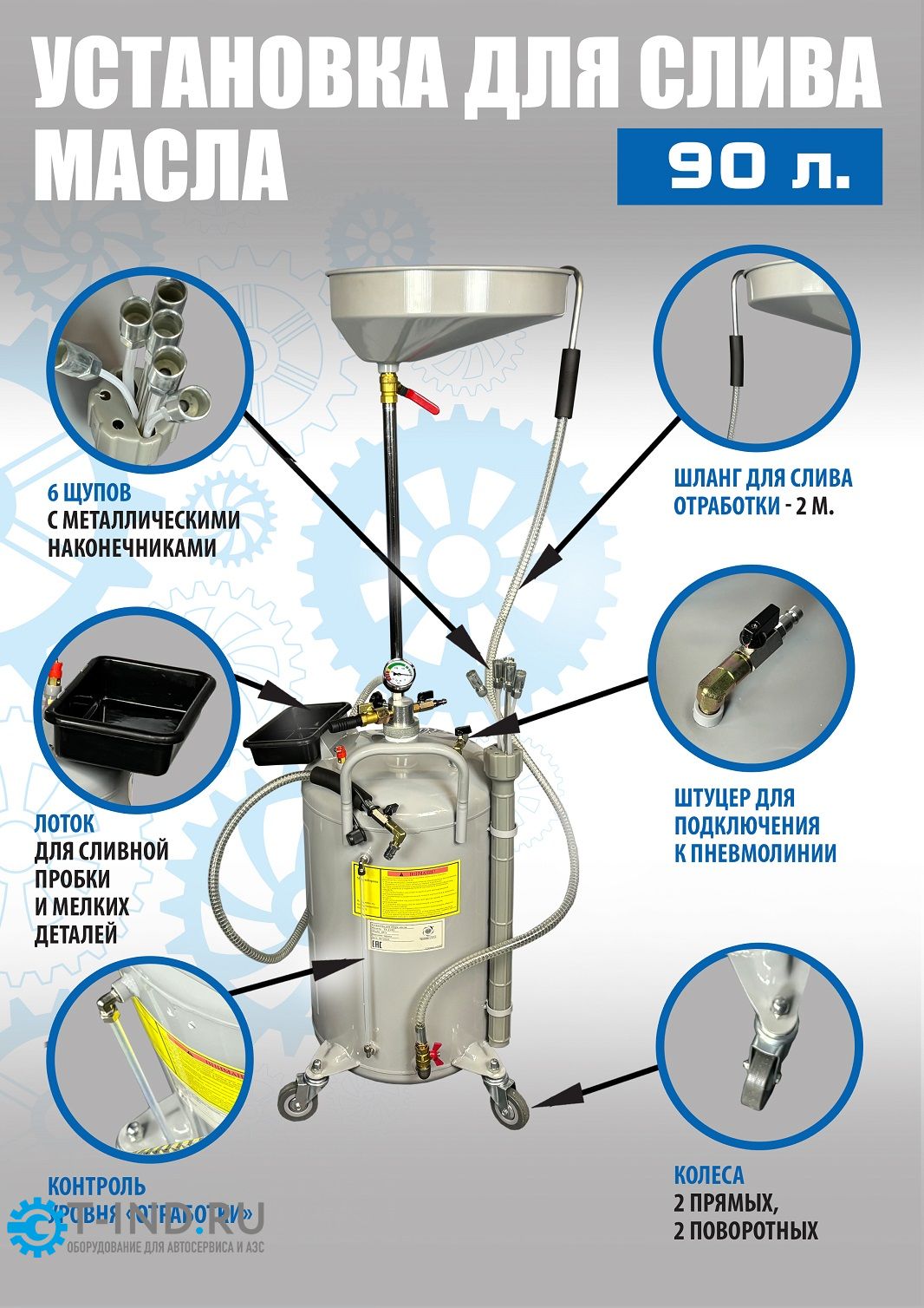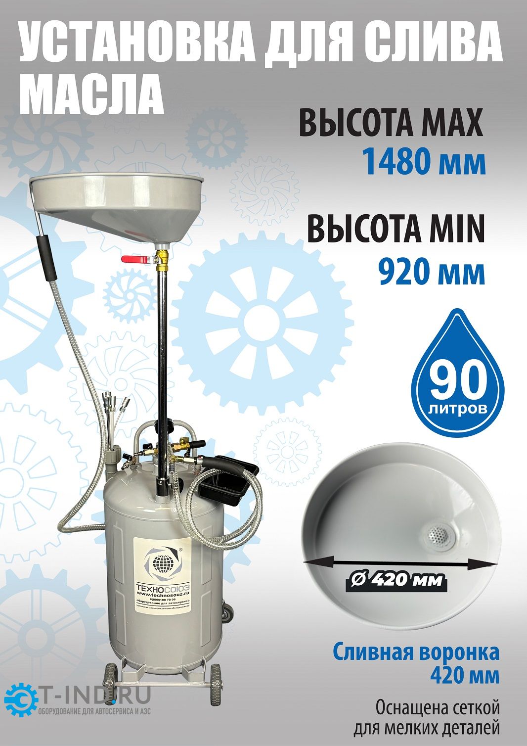 - Маслосборник помещает 90 литров отработанного масла и антифриза. Бак 80л и чаша (воронка) 10л.