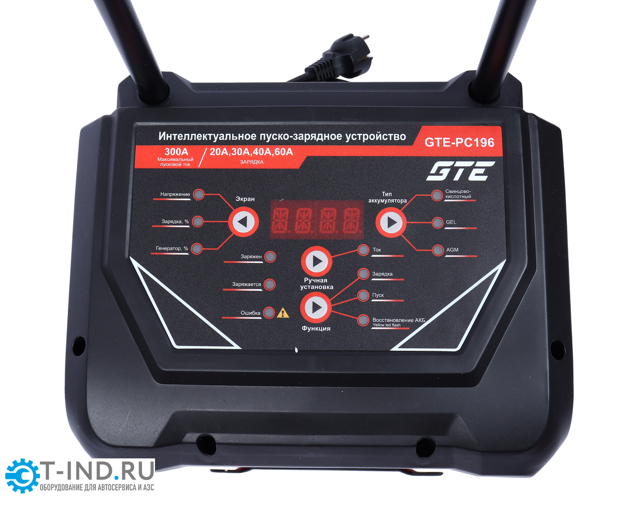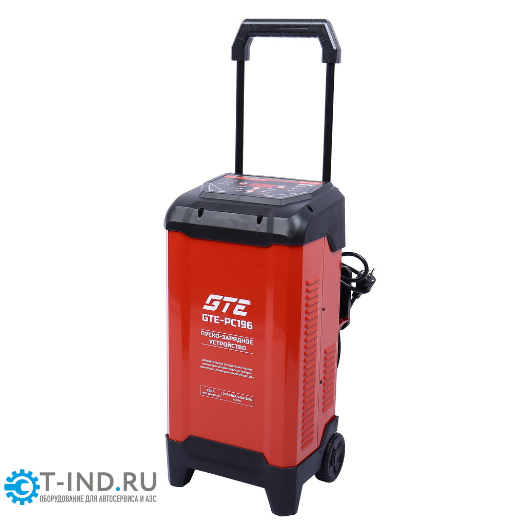 GTE-PC196 — передвижное пуско-зарядное устройство для зарядки свинцово-кислотных аккумуляторов 12/24 В и запуска двигателей с пусковым током до 300 А, предназначенное для профессионального применения в автосервисах и на СТО.