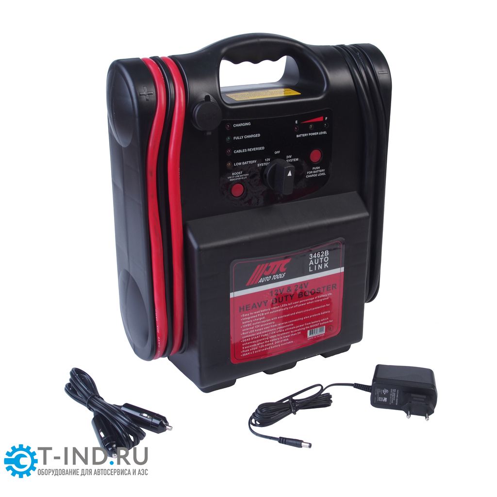 Пусковое устройство JTC-3462B — это профессиональный бустер для запуска двигателей 12/24 В с максимальным пусковым током 4200/2100 А, встроенным аккумулятором 20 А·ч и защитой от переполюсовки, подходящий для грузовиков, автобусов и спецтехники.