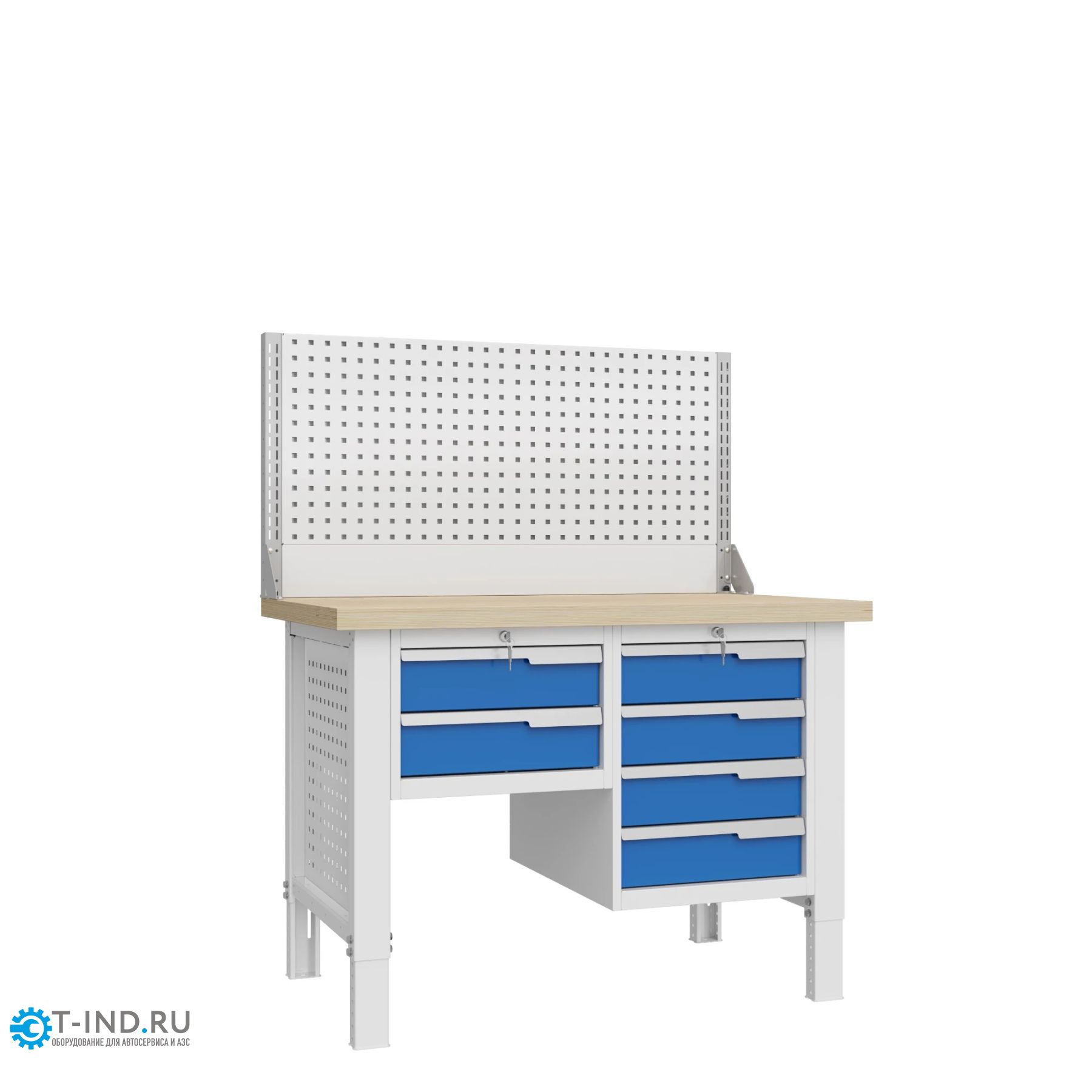 Верстак сборно-разборной конструкции. Соответствует ГОСТ Р 58863-2020. С единой рабочей поверхностью из влагостойкой фанеры марки ФСФ. Рама верстака выполнена из холоднокатаной стали толщиной 2мм, модули - из стали 0,8мм. Верстак усилен специальной продольной балкой. Регулировка рабочего места по высоте осуществляется в диапазоне от 700 до 950мм с шагом 25мм. Предусмотрена возможность тонкой регулировки усиленным резьбовым подпятником. Нагрузка на ящики верстака - до 40 кг, на полки - до 60кг. Общая распределенная нагрузка на рабочую поверхность 1500кг. Имеет возможность стыковки в единую рабочую поверхность с верстаками серии Constructor Возможна дополнительная опция - металлическая накладка на столешницу.