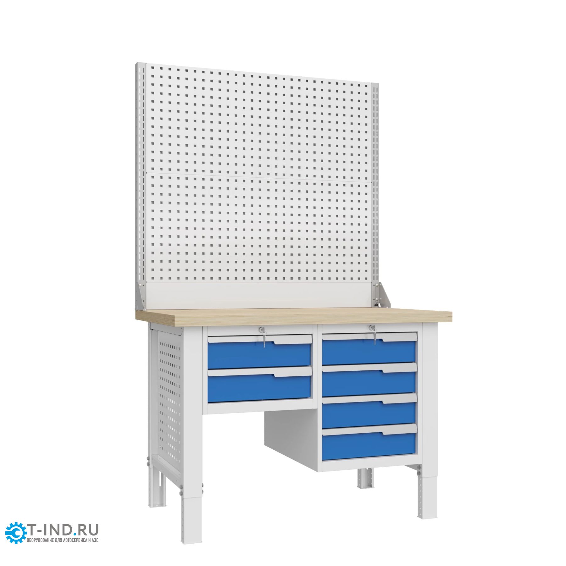 Верстак сборно-разборной конструкции. Соответствует ГОСТ Р 58863-2020. С единой рабочей поверхностью из влагостойкой фанеры марки ФСФ. Рама верстака выполнена из холоднокатаной стали толщиной 2мм, модули - из стали 0,8мм. Верстак усилен специальной продольной балкой. Регулировка рабочего места по высоте осуществляется в диапазоне от 700 до 950мм с шагом 25мм. Предусмотрена возможность тонкой регулировки усиленным резьбовым подпятником. Нагрузка на ящики верстака - до 40 кг, на полки - до 60кг. Общая распределенная нагрузка на рабочую поверхность 1500кг. Имеет возможность стыковки в единую рабочую поверхность с верстаками серии Constructor Возможна дополнительная опция - металлическая накладка на столешницу.