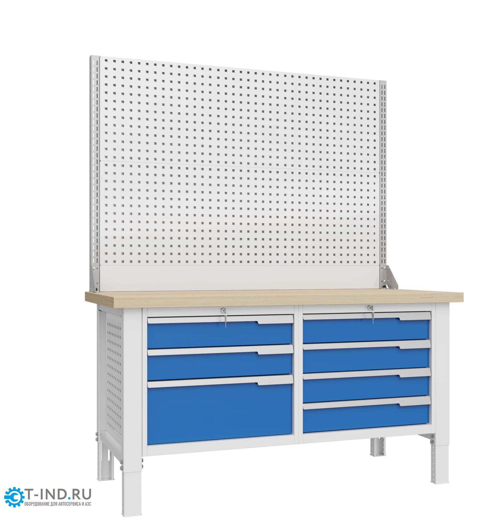 Верстак сборно-разборной конструкции. Соответствует ГОСТ Р 58863-2020. С единой рабочей поверхностью из влагостойкой фанеры марки ФСФ. Рама верстака выполнена из холоднокатаной стали толщиной 2мм, модули - из стали 0,8мм. Верстак усилен специальной продольной балкой. Регулировка рабочего места по высоте осуществляется в диапазоне от 700 до 950мм с шагом 25мм. Предусмотрена возможность тонкой регулировки усиленным резьбовым подпятником. Нагрузка на ящики верстака - до 40 кг, на полки - до 60кг. Общая распределенная нагрузка на рабочую поверхность 1500кг. Имеет возможность стыковки в единую рабочую поверхность с верстаками серии Constructor Возможна дополнительная опция - металлическая накладка на столешницу.