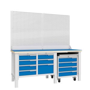 Верстак сборно-разборной конструкции. Соответствует ГОСТ Р 58863-2020. С единой рабочей поверхностью из влагостойкой фанеры марки ФСФ. Рама верстака выполнена из холоднокатаной стали толщиной 2мм, модули - из стали 0,8мм. Верстак усилен специальной продольной балкой. Регулировка рабочего места по высоте осуществляется в диапазоне от 700 до 950мм с шагом 25мм. Предусмотрена возможность тонкой регулировки усиленным резьбовым подпятником. Нагрузка на ящики верстака - до 40 кг, на полки - до 60кг. Общая распределенная нагрузка на рабочую поверхность 1500кг. Имеет возможность стыковки в единую рабочую поверхность с верстаками серии Constructor Возможна дополнительная опция - металлическая накладка на столешницу.