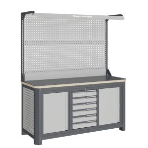 Квадратная перфорация на элементах верстака предназначена для установки крючков, держателей и других аксессуаров, имеет размеры: квадрат 12х12мм. шаг 38мм. Экран (перфорированная панель) верстака выполнен с квадратной перфорацией 12х12 мм с шагом 38 мм для установки крючков, держателей и других аксессуаров. Экран крепятся к столешнице с помощью специальных кронштейнов. Максимальная масса груза, равномерно распределенного по поверхности экрана, составляет 71 кг. Комплект освещения устанавливается над верстаком. В комплекте идет защитный козырек, кронштейны и лампа с магнитными креплениями, которые позволяют менять ее положение.