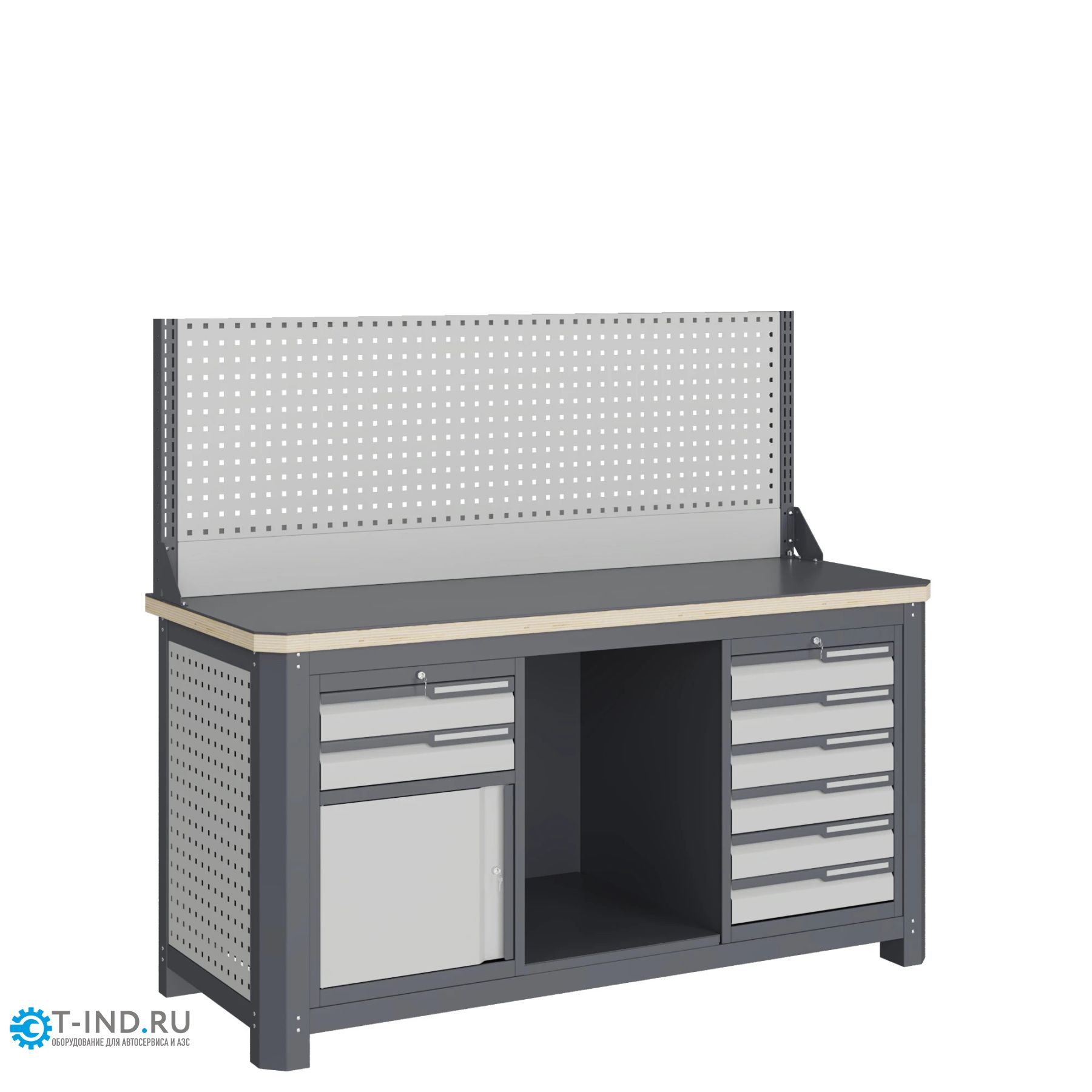 Предназначен для выполнения сборочных, ремонтных, слесарных, монтажных и других видов работ на производстве, в сервисных центрах, мастерских, гаражах. Рама верстака выполнена их холоднокатаной стали. Опоры допускают частичную регулировку по высоте для компенсации неровности пола. Все металлические элементы покрыты полиэфирной порошковой краской, обеспечивающей хорошую износостойкость покрытия и невосприимчивость его к моющим средствам и смазочным веществам. Верстак имеет декларацию соответствия ТР ТС 025/2012 «О безопасности мебельной продукции». Верстак имеет сертификат соответствия ГОСТ Р 58863-2020 «Столы производственные. Верстаки из металла. Общие технические условия». Столешница состоит из листа влагостойкой фанеры марки ФСФ толщиной 40 мм, которая покрыта лаком-антисептиком и листом горячекатаной стали толщиной 5 мм. Глубина столешниц 743 мм. Максимальная масса груза, равномерно распределенного по столешнице, составляет 1500 кг.