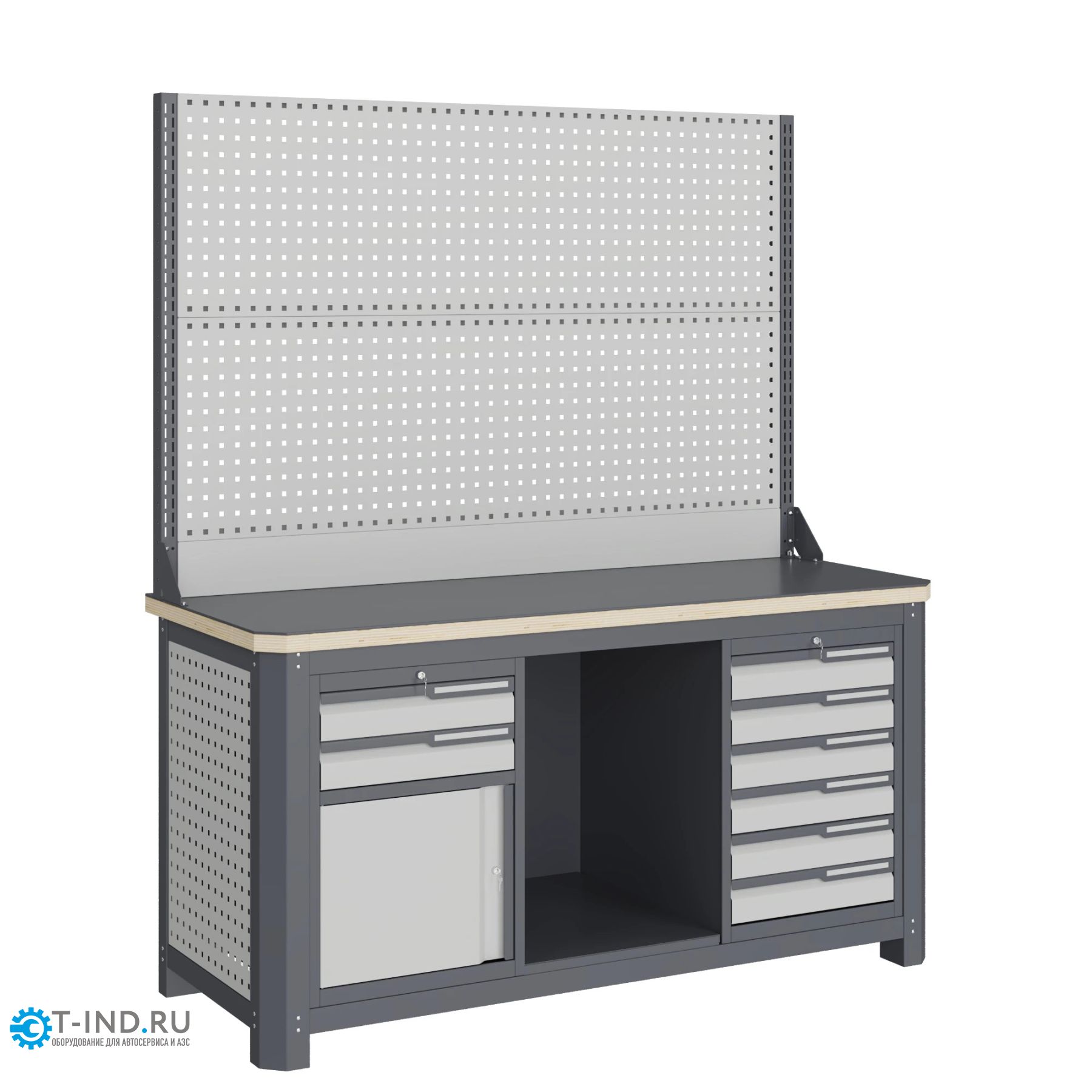 Модули с ящиками снабжены общим центральным замком с поворотом ригеля 180 градусов и подпружиненной тягой. В комплекте два ключа для каждого замка. Квадратная перфорация на элементах верстака предназначена для установки крючков, держателей и других аксессуаров, имеет размеры: квадрат 12х12мм. шаг 38мм. Экран (перфорированная панель) верстака выполнен с квадратной перфорацией 12х12 мм с шагом 38 мм для установки крючков, держателей и других аксессуаров. Экран крепятся к столешнице с помощью специальных кронштейнов. Максимальная масса груза, равномерно распределенного по поверхности экрана, составляет 71 кг.
