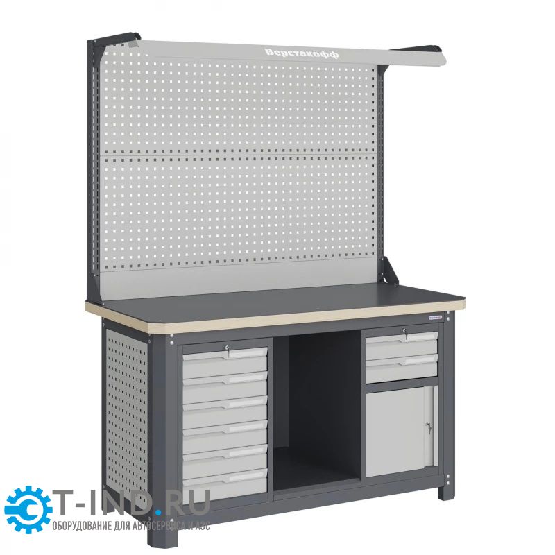 столешницы шириной 1493 мм, рамы верстака, состоящей из опор, перемычек, боковых перфопанелей, малых модулей S6 и S9, комплекта полка-стенка SW1, двойного экрана с кронштейнами и комплектом освещения.