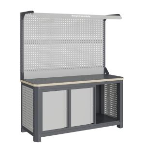 Модули с ящиками снабжены общим центральным замком с поворотом ригеля 180 градусов и подпружиненной тягой. В комплекте два ключа для каждого замка. Квадратная перфорация на элементах верстака предназначена для установки крючков, держателей и других аксессуаров, имеет размеры: квадрат 12х12мм. шаг 38мм. Экран (перфорированная панель) верстака выполнен с квадратной перфорацией 12х12 мм с шагом 38 мм для установки крючков, держателей и других аксессуаров. Экран крепятся к столешнице с помощью специальных кронштейнов. Максимальная масса груза, равномерно распределенного по поверхности экрана, составляет 71 кг. Комплект освещения устанавливается над верстаком. В комплекте идет защитный козырек, кронштейны и лампа с магнитными креплениями, которые позволяют менять ее положение.