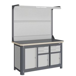 Полка модуля имеет размеры (ВхШхГ), не более: 25 х 367 х 510 мм. Максимально допустимая масса груза, равномерно распределенного по поверхности любого выдвижного ящика и полки 31 кг. Модули с ящиками снабжены общим центральным замком с поворотом ригеля 180 градусов и подпружиненной тягой. В комплекте два ключа для каждого замка. Квадратная перфорация на элементах верстака предназначена для установки крючков, держателей и других аксессуаров, имеет размеры: квадрат 12х12мм. шаг 38мм. Экран (перфорированная панель) верстака выполнен с квадратной перфорацией 12х12 мм с шагом 38 мм для установки крючков, держателей и других аксессуаров. Экран крепятся к столешнице с помощью специальных кронштейнов. Максимальная масса груза, равномерно распределенного по поверхности экрана, составляет 71 кг. Комплект освещения устанавливается над верстаком. В комплекте идет защитный козырек, кронштейны и лампа с магнитными креплениями, которые позволяют менять ее положение.