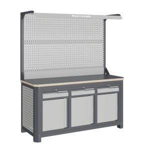 Модули с ящиками снабжены общим центральным замком с поворотом ригеля 180 градусов и подпружиненной тягой. В комплекте два ключа для каждого замка. Квадратная перфорация на элементах верстака предназначена для установки крючков, держателей и других аксессуаров, имеет размеры: квадрат 12х12мм. шаг 38мм. Экран (перфорированная панель) верстака выполнен с квадратной перфорацией 12х12 мм с шагом 38 мм для установки крючков, держателей и других аксессуаров. Экран крепятся к столешнице с помощью специальных кронштейнов. Максимальная масса груза, равномерно распределенного по поверхности экрана, составляет 71 кг. Комплект освещения устанавливается над верстаком. В комплекте идет защитный козырек, кронштейны и лампа с магнитными креплениями, которые позволяют менять ее положение.