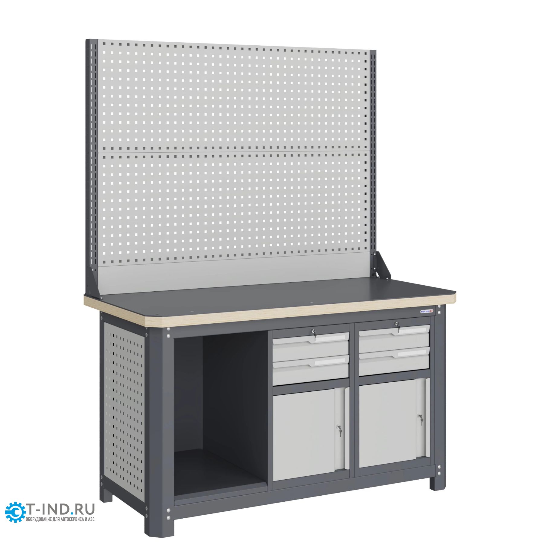 столешницы шириной 1493 мм, рамы верстака, состоящей из опор, перемычек, боковых перфопанелей, двух малых модулей S9, комплекта полка-стенка SW1, двойного экрана с кронштейнами.
