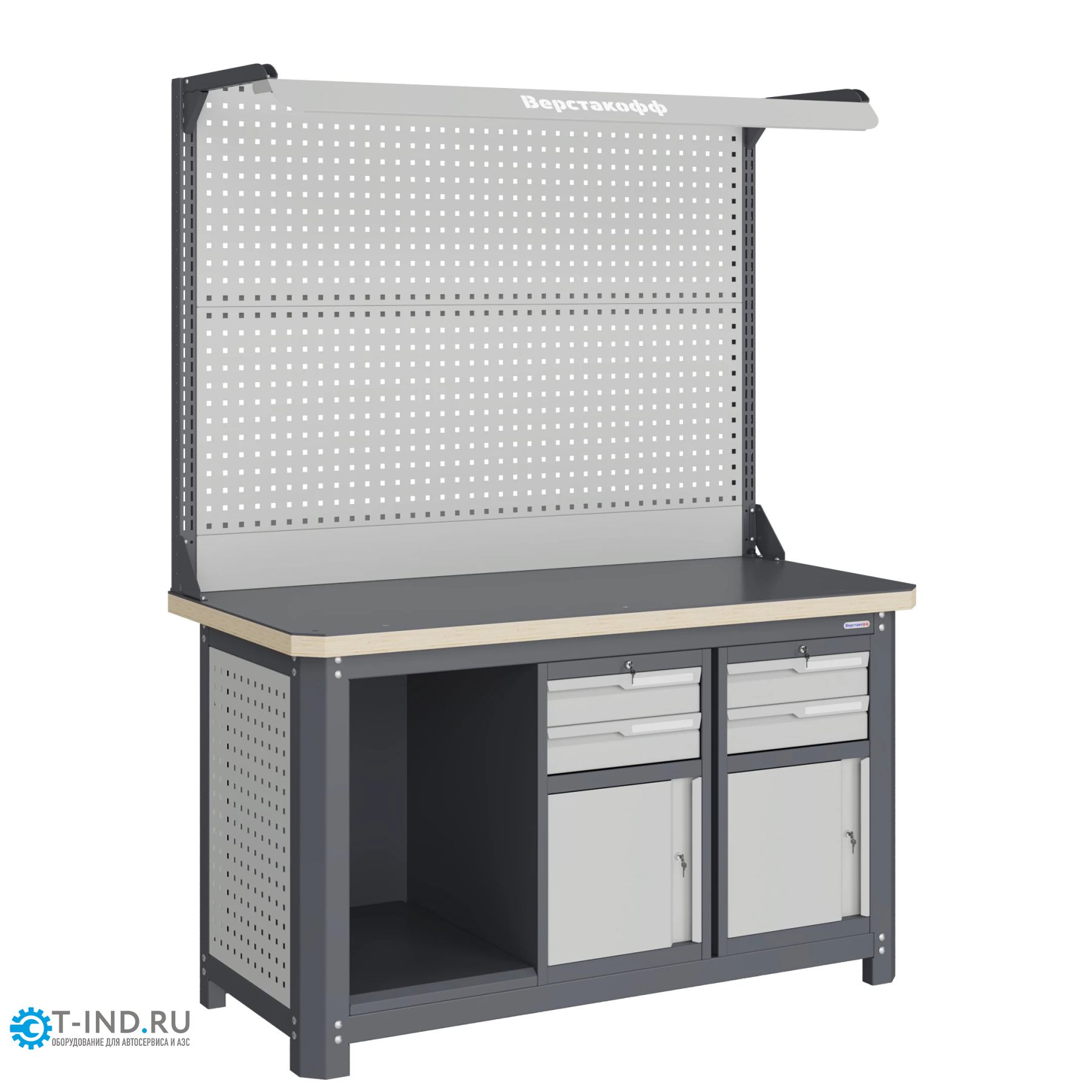 столешницы шириной 1493 мм, рамы верстака, состоящей из опор, перемычек, боковых перфопанелей, двух малых модулей S9, комплекта полка-стенка SW1, двойного экрана с кронштейнами и комплектом освещения.