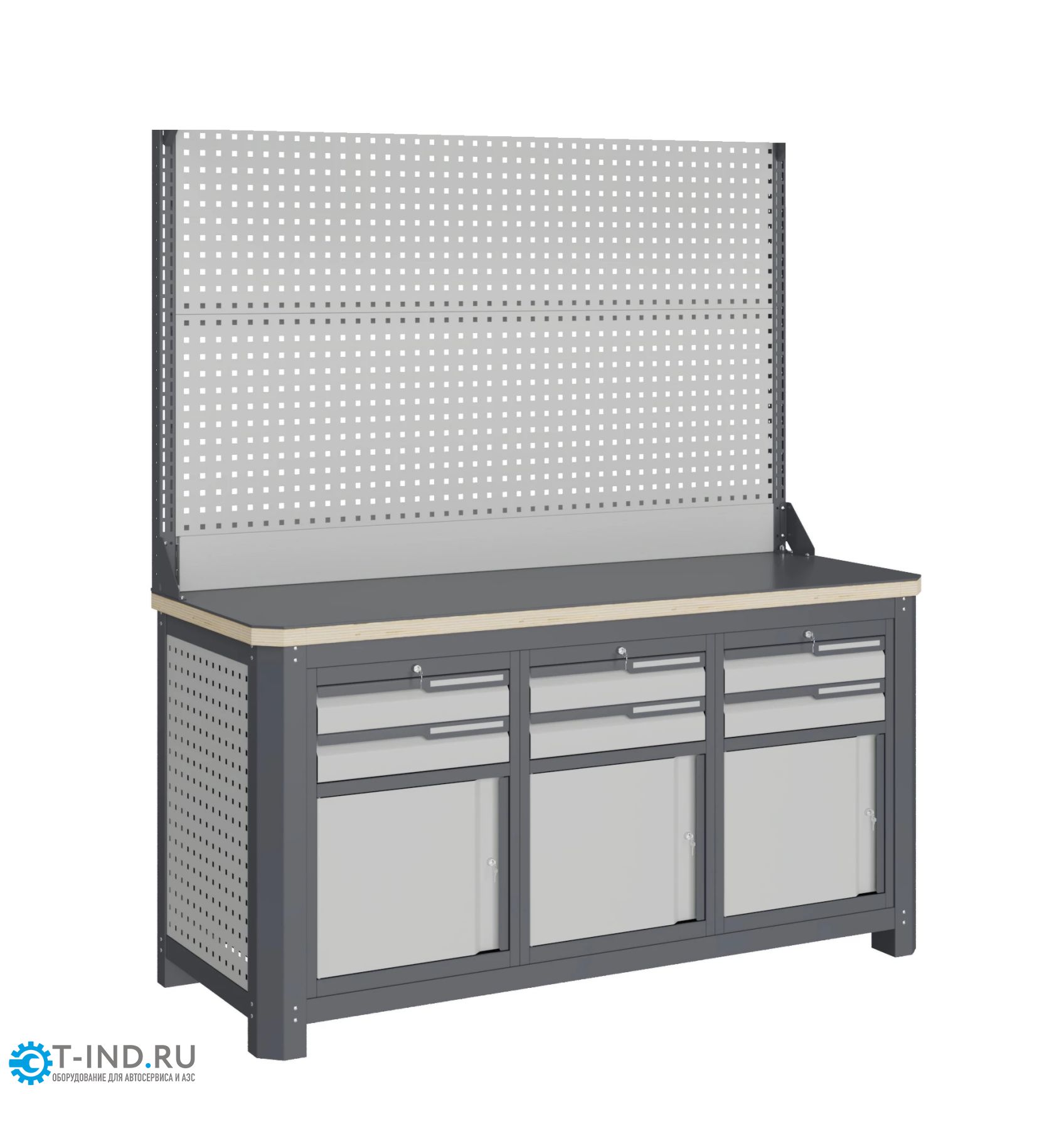 Максимально допустимая масса груза, равномерно распределенного по поверхности любого выдвижного ящика и полки 31 кг. Модули с ящиками снабжены общим центральным замком с поворотом ригеля 180 градусов и подпружиненной тягой. В комплекте два ключа для каждого замка. Квадратная перфорация на элементах верстака предназначена для установки крючков, держателей и других аксессуаров, имеет размеры: квадрат 12х12мм. шаг 38мм. Экран (перфорированная панель) верстака выполнен с квадратной перфорацией 12х12 мм с шагом 38 мм для установки крючков, держателей и других аксессуаров. Экран крепятся к столешнице с помощью специальных кронштейнов. Максимальная масса груза, равномерно распределенного по поверхности экрана, составляет 71 кг.