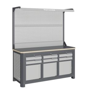 Модули с ящиками снабжены общим центральным замком с поворотом ригеля 180 градусов и подпружиненной тягой. В комплекте два ключа для каждого замка. Квадратная перфорация на элементах верстака предназначена для установки крючков, держателей и других аксессуаров, имеет размеры: квадрат 12х12мм. шаг 38мм. Экран (перфорированная панель) верстака выполнен с квадратной перфорацией 12х12 мм с шагом 38 мм для установки крючков, держателей и других аксессуаров. Экран крепятся к столешнице с помощью специальных кронштейнов. Максимальная масса груза, равномерно распределенного по поверхности экрана, составляет 71 кг. Комплект освещения устанавливается над верстаком. В комплекте идет защитный козырек, кронштейны и лампа с магнитными креплениями, которые позволяют менять ее положение.