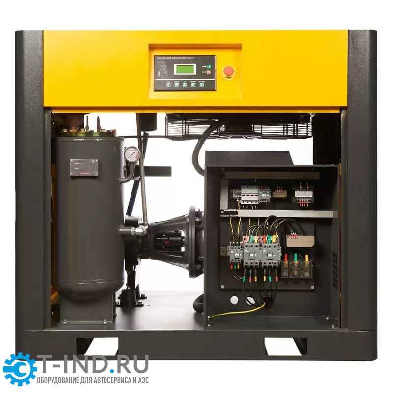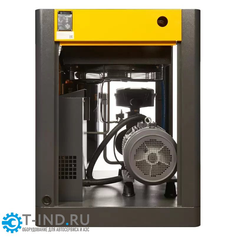 - Низкий уровень шума также достигается применением шумопоглощающих панелей, установкой электродвигателя и винтового блока на виброопорах.