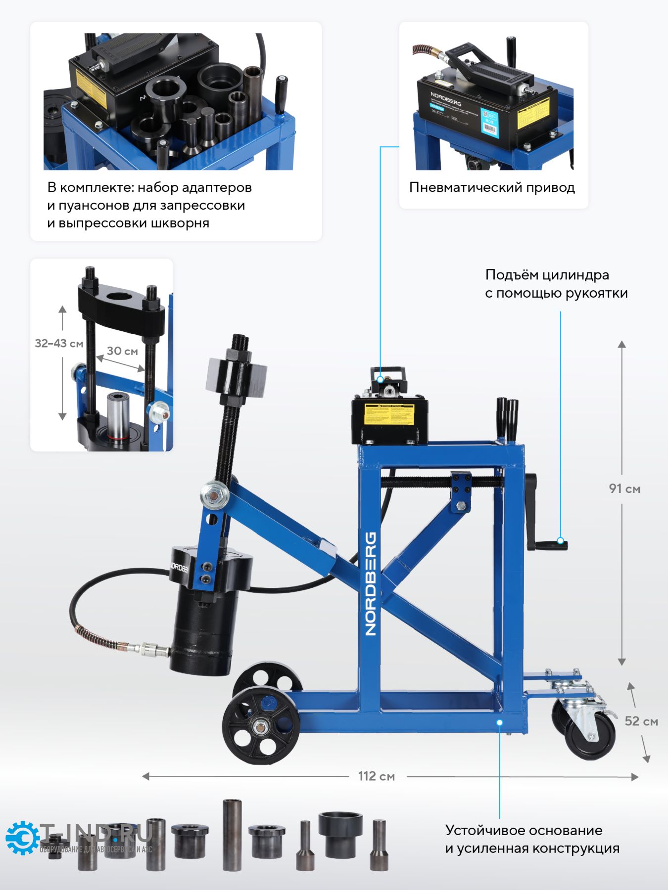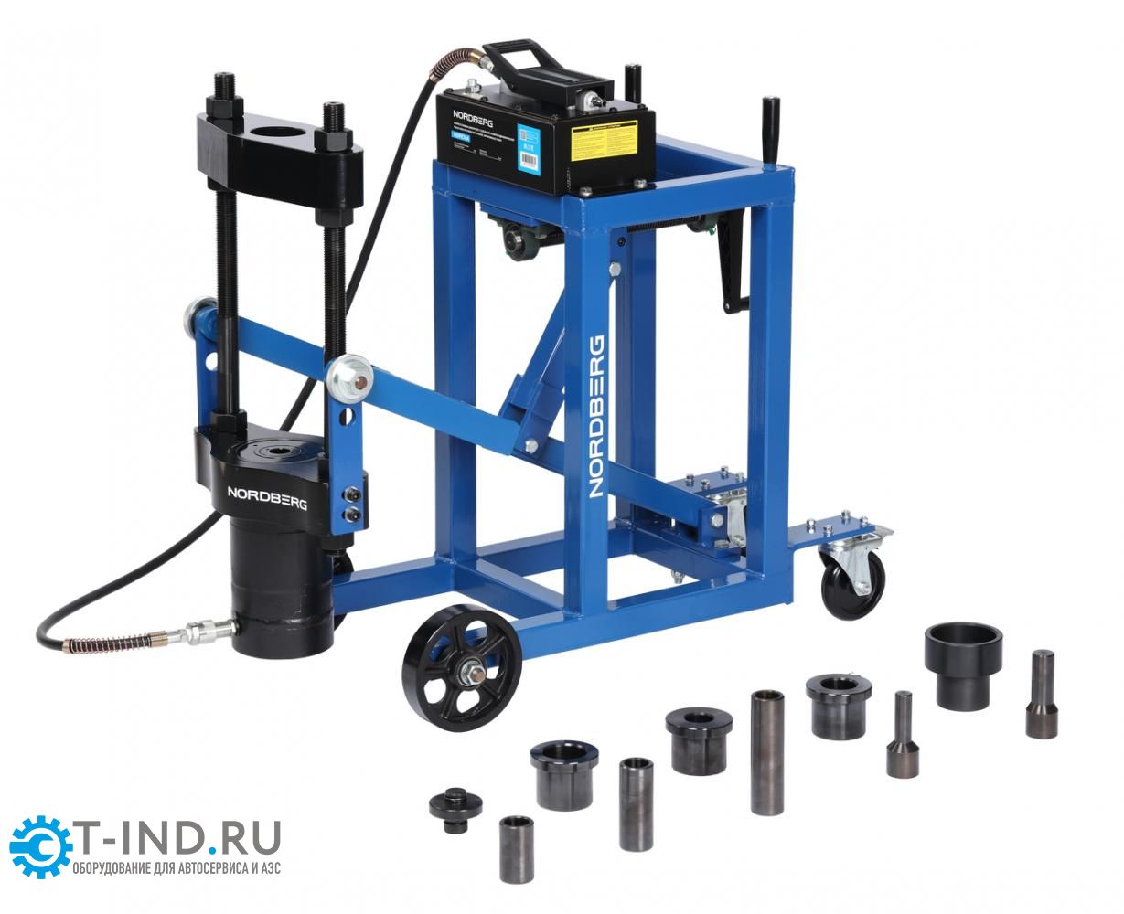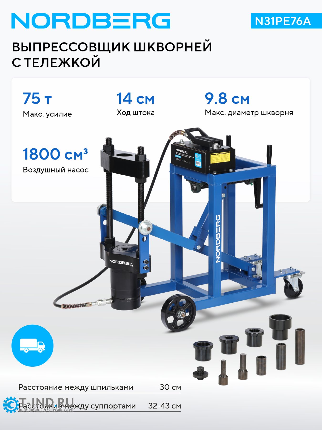 NORDBERG N31PE76A — выпрессовщик шкворней с тележкой гидравлический с пневмоприводом. Предназначен для выпрессовки и запрессовки шкворней автомобилей, автобусов и спецтехники. Позволяет быстро и безопасно выполнять работы по восстановлению подвески, минимизируя риск повреждения деталей.